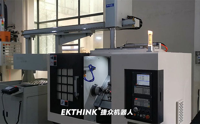 數(shù)控車床一拖二機(jī)械手連線自動(dòng)上下料,視頻來自捷眾機(jī)器人。桁架機(jī)械手一般安裝在機(jī)床上方,軌跡單一,占用空間小,能夠?qū)崿F(xiàn)一對(duì)一、一對(duì)二或多機(jī)并聯(lián)。13